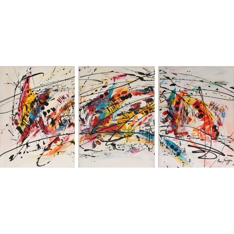 Ce tableau triptyque colore est réalisé à la peinture acrylique de haute qualité. Pour la réalisation du triptyque, les trois toiles sont mises côte à côte et l'artiste réalise le tableau contemporain comme une seule et même oeuvre. Les trois parties sont ensuites séparées et l'artiste procède ensuite au vernissage de chaque partie. Tous les châssis de ce triptyque moderne sont contresignés au dos par l'artiste peintre et disposent d'un système d'accrochage, ainsi vous n'avez que 3 clous à aligner au mur.